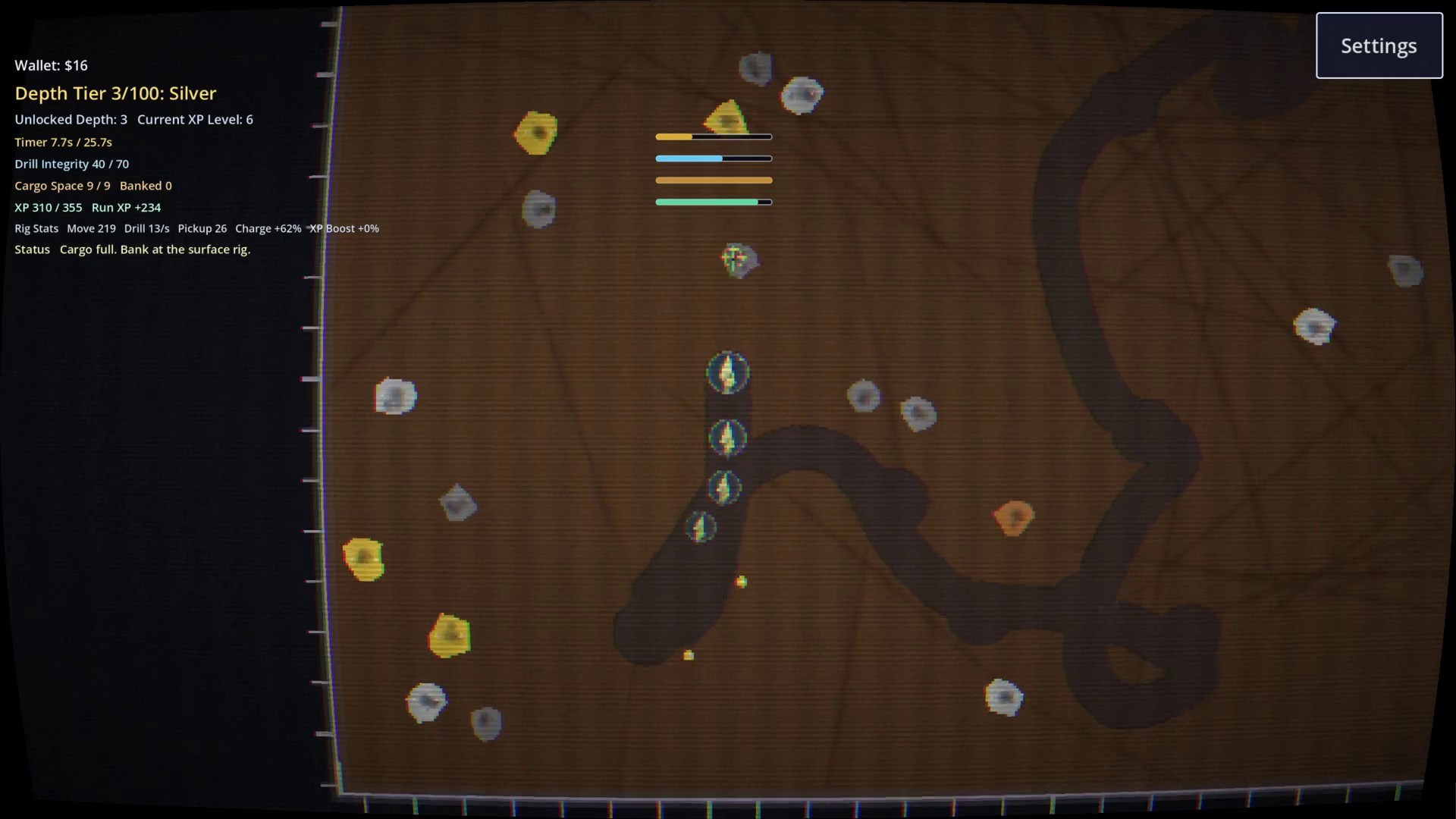Deepcore is a run-based mining incremental built around short, high-pressure dives. Steer a drill rig through destructible underground terrain, break open ore, and get the haul back to the base ring before the timer expires, the drill burns out, or cargo pressure ends the push.