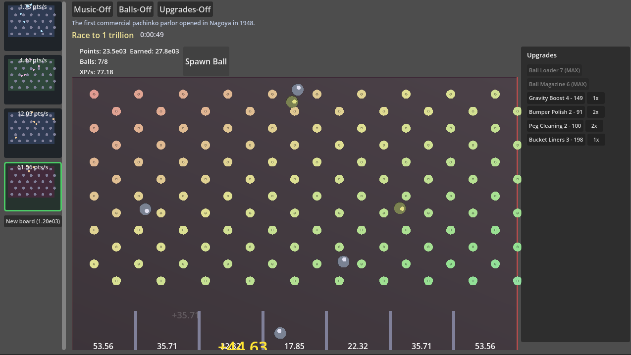 Drop Pachinko Balls to score points, use points to unlock upgrades and more Pachinko boards. The points from each will continue to accrue.