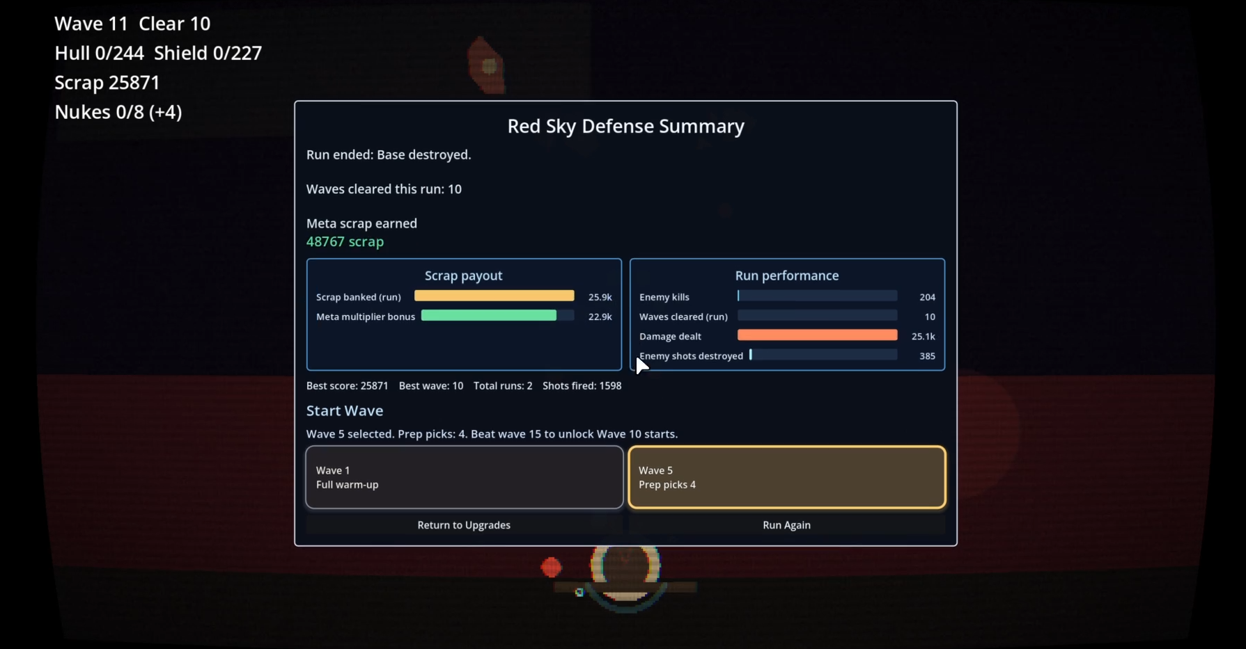 Red Sky Defense is a wave-defense incremental: you fight escalating waves, earn scrap from kills and wave clears, and spend between rounds on upgrade offers and long-term meta nodes. The run is about staying ahead of scaling enemies while your build specializes—more damage, better survivability, stronger area tools, and unlocks that open new layers of defense.